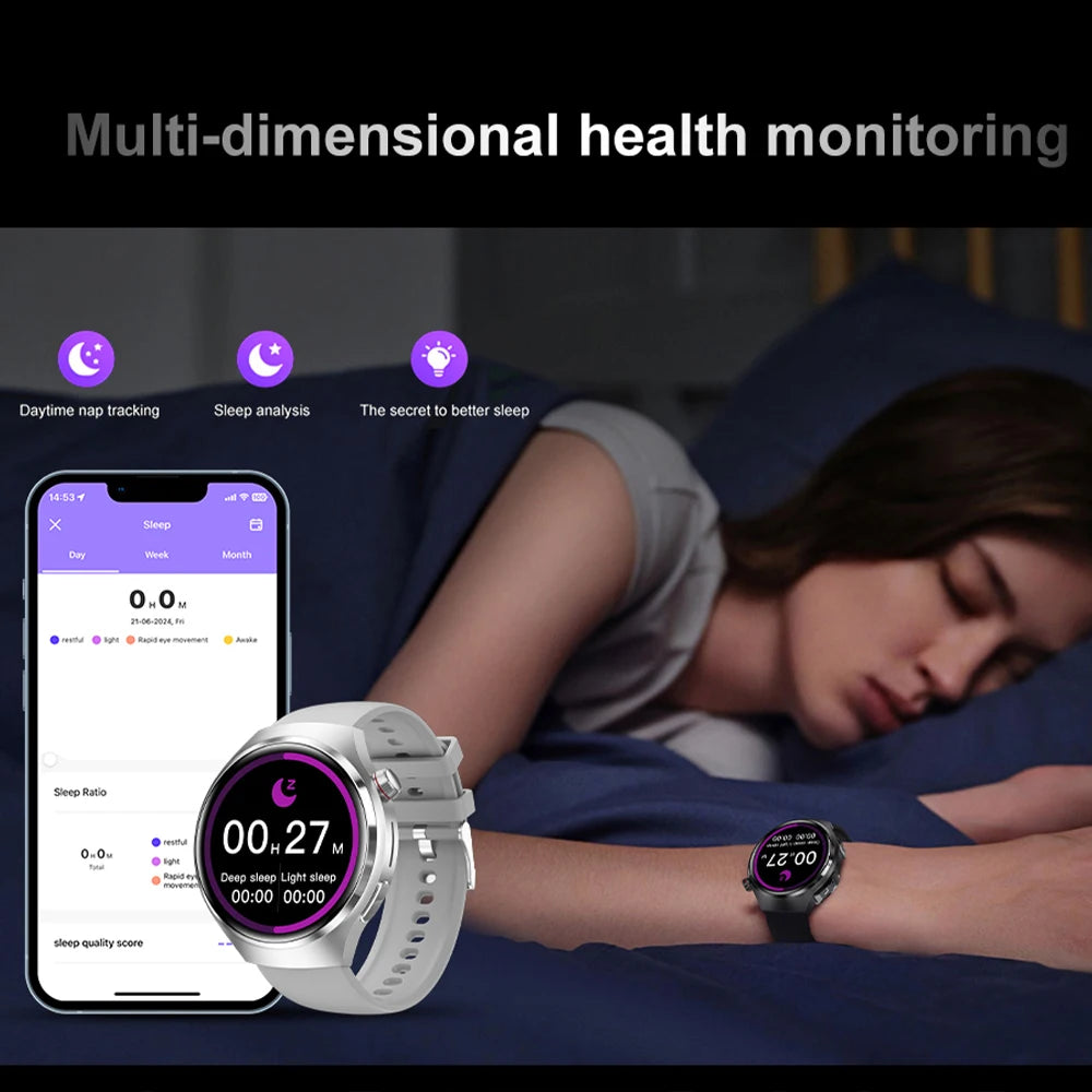 سماعات بلوتوث (2 في 1)، بوصلة، هاتف (جهات الاتصال، سجل المكالمات، لوحة الاتصال، إعدادات المكالمات، SOS)، رسائل، تمارين، عد الخطوات، تتبع النوم، موسيقى، معدل ضربات القلب، ضغط الدم، أكسجين الدم، درجة حرارة الجسم، تتبع صحة الإناث، تذكيرات الأدوية، تذكيرات المياه، تذكيرات الخمول، تبديل الأسلوب، التقويم، مساعد صوتي، الطقس، التحكم في الكاميرا، آلة حاسبة، تمارين التنفس، رمز الاستجابة السريعة المقسم، ساعة الإيقاف.