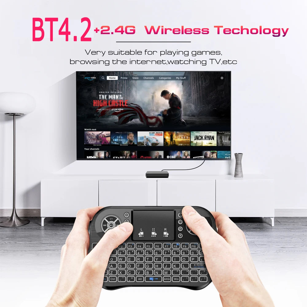 لوحة مفاتيح صغيرة لاسلكية بتقنية البلوتوث - وضع مزدوج 2.4 جيجاهرتز، إضاءة خلفية RGB، تخطيط باللغات الإنجليزية/الروسية/الفرنسية/الإسبانية/البرتغالية، لأجهزة Android TV Box، والكمبيوتر الشخصي، والكمبيوتر المحمول، وجهاز العرض