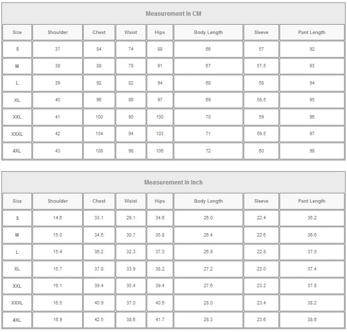 | Größe | Schulter | Brust | Taille | Hüften | Körperlänge | Ärmel | Hosenlänge |