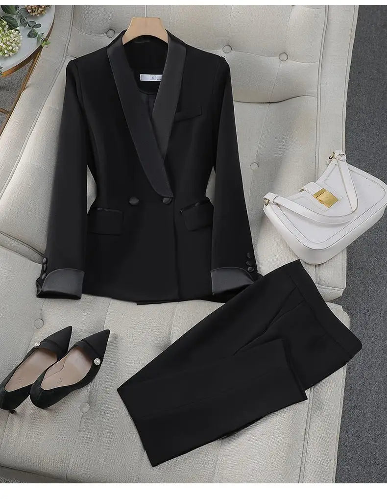 Patchwork-Blazer-Anzug für Damen im Herbst – Zweireihiger Mantel & Hose mit hohem Bund