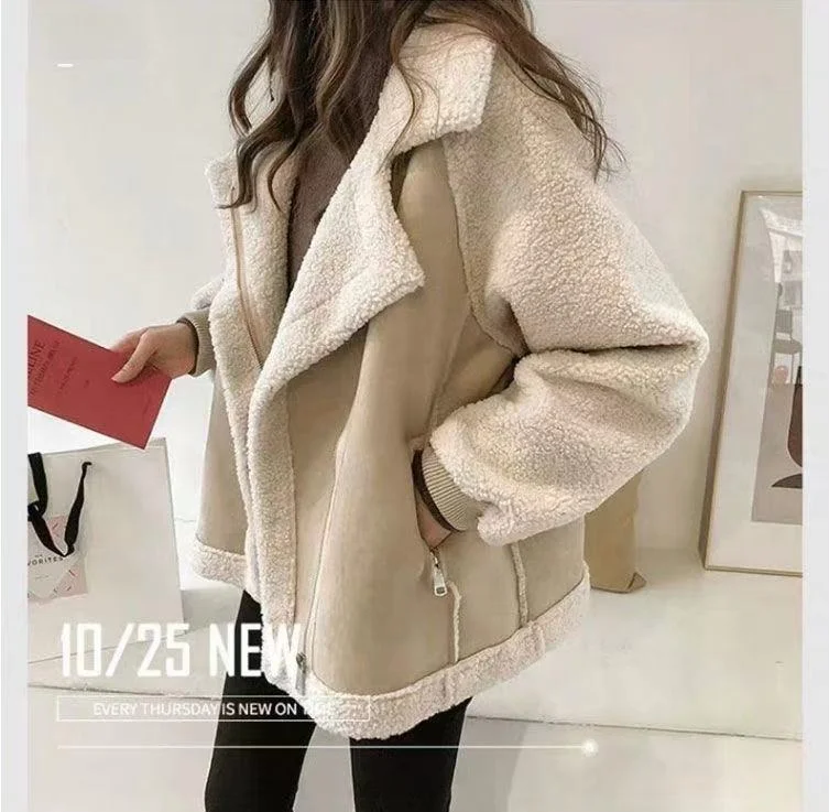 Chic Suede Lamb Fur Jacket Loose Fit Plus Size Cotton Coat Autumn Winter Fashion Outerwear for Plump Sisters