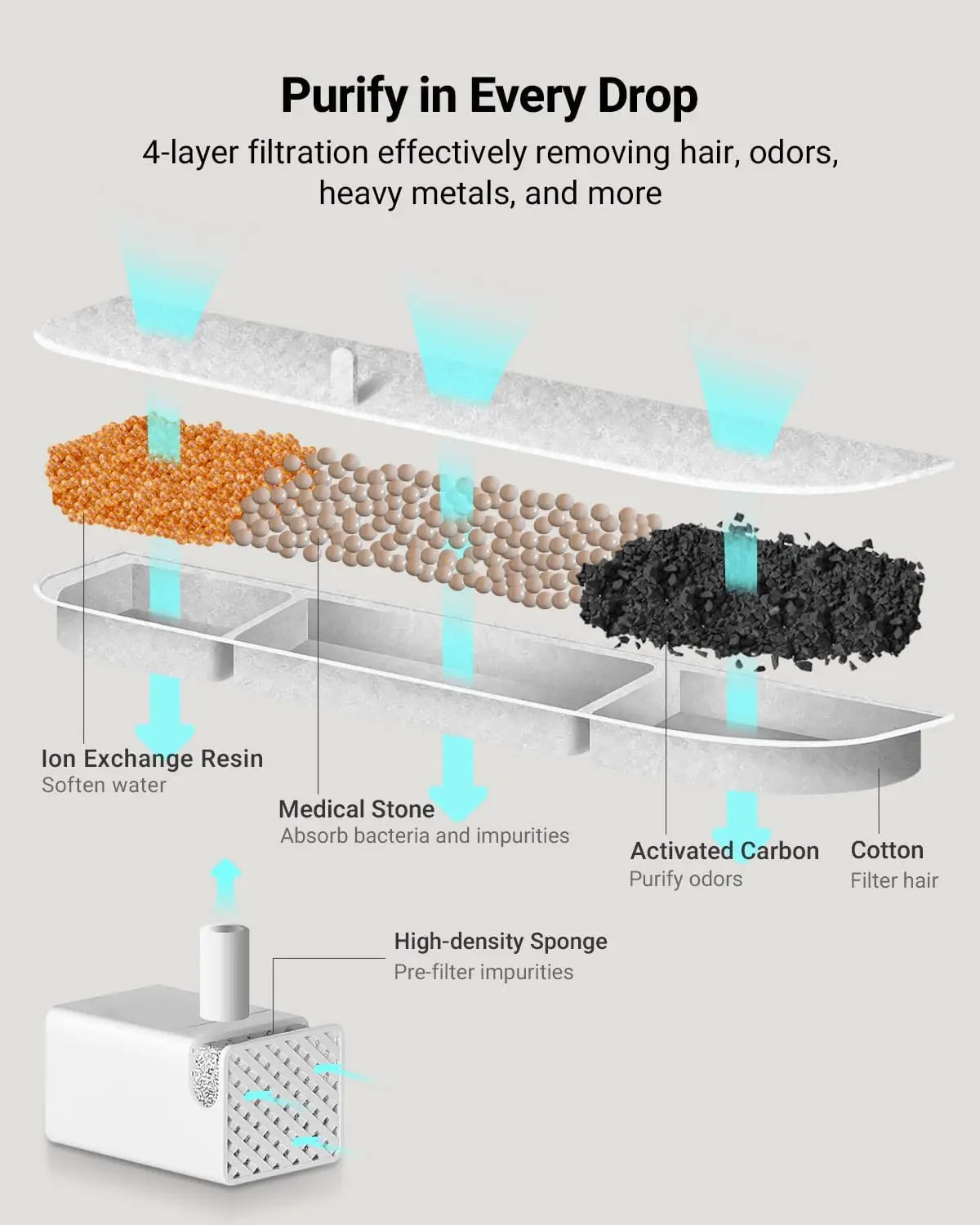 【Vertical Filtration System】Each cat fountain filter is composed of activated carbon, ion exchange resin and non-woven fabric. The combination of the activated carbon filter and the sponge helps to filter out debris, hair, and particles, softens water quality,while also absorbing any unpleasant tastes or odors.