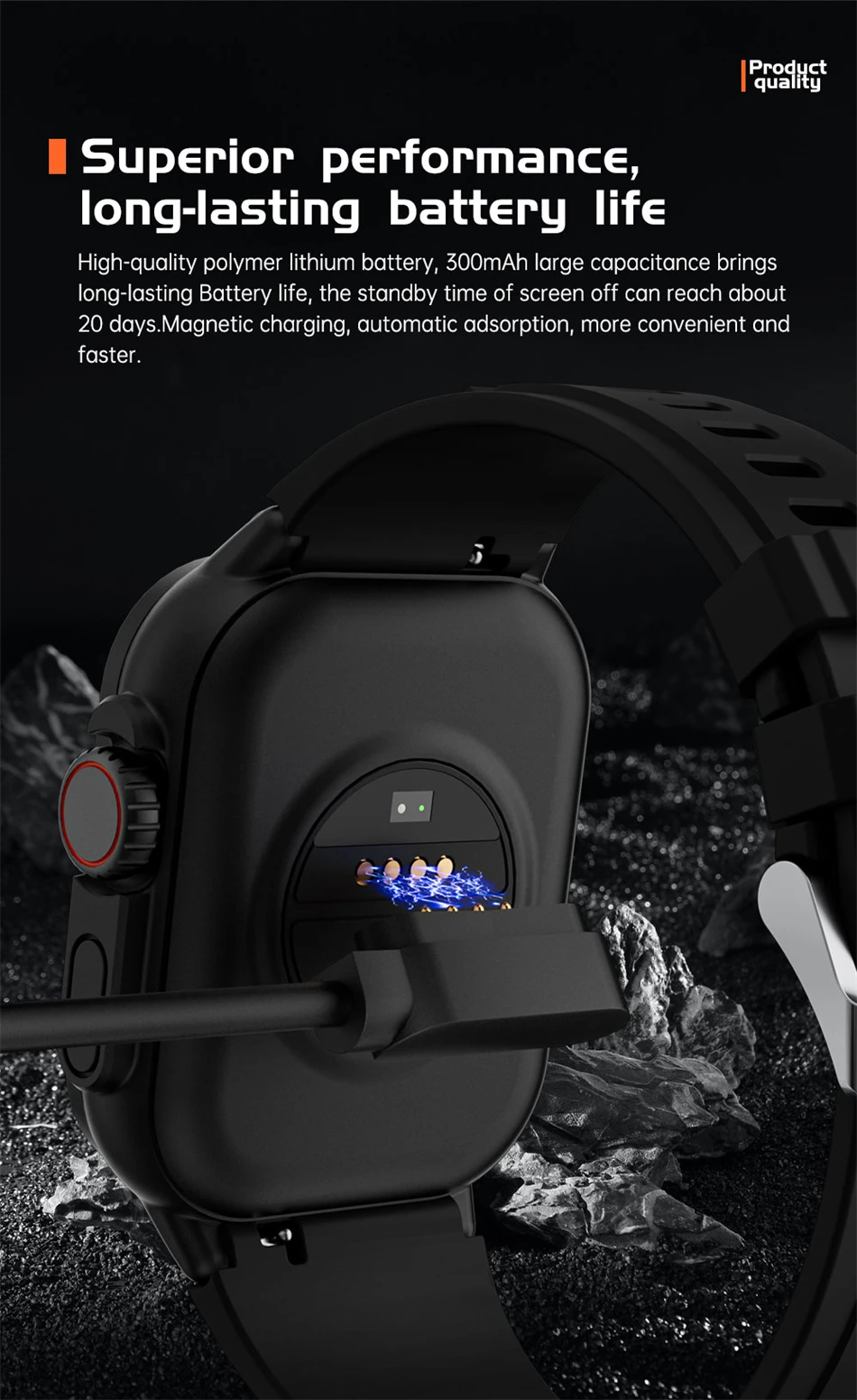 Working time: 5-7 days, charging time: 2H, standby time: more than 15 days, battery: 300mAh; Charging mode: magnetic charging;