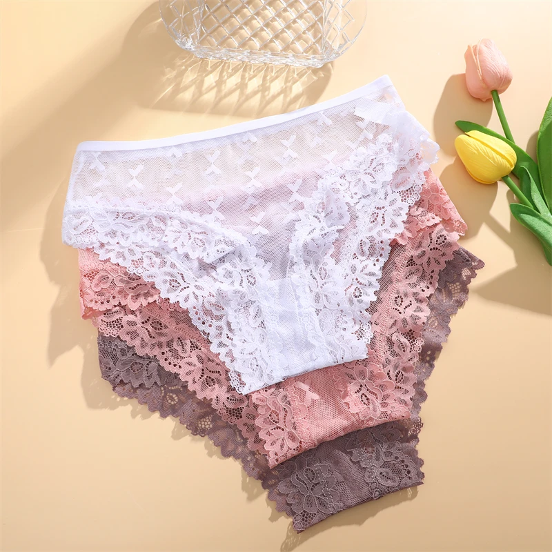FINETOO 5PCS Women's Lace Hollow Out Panties Sexy Floral Solid Color Underwear Lingerie S-XL