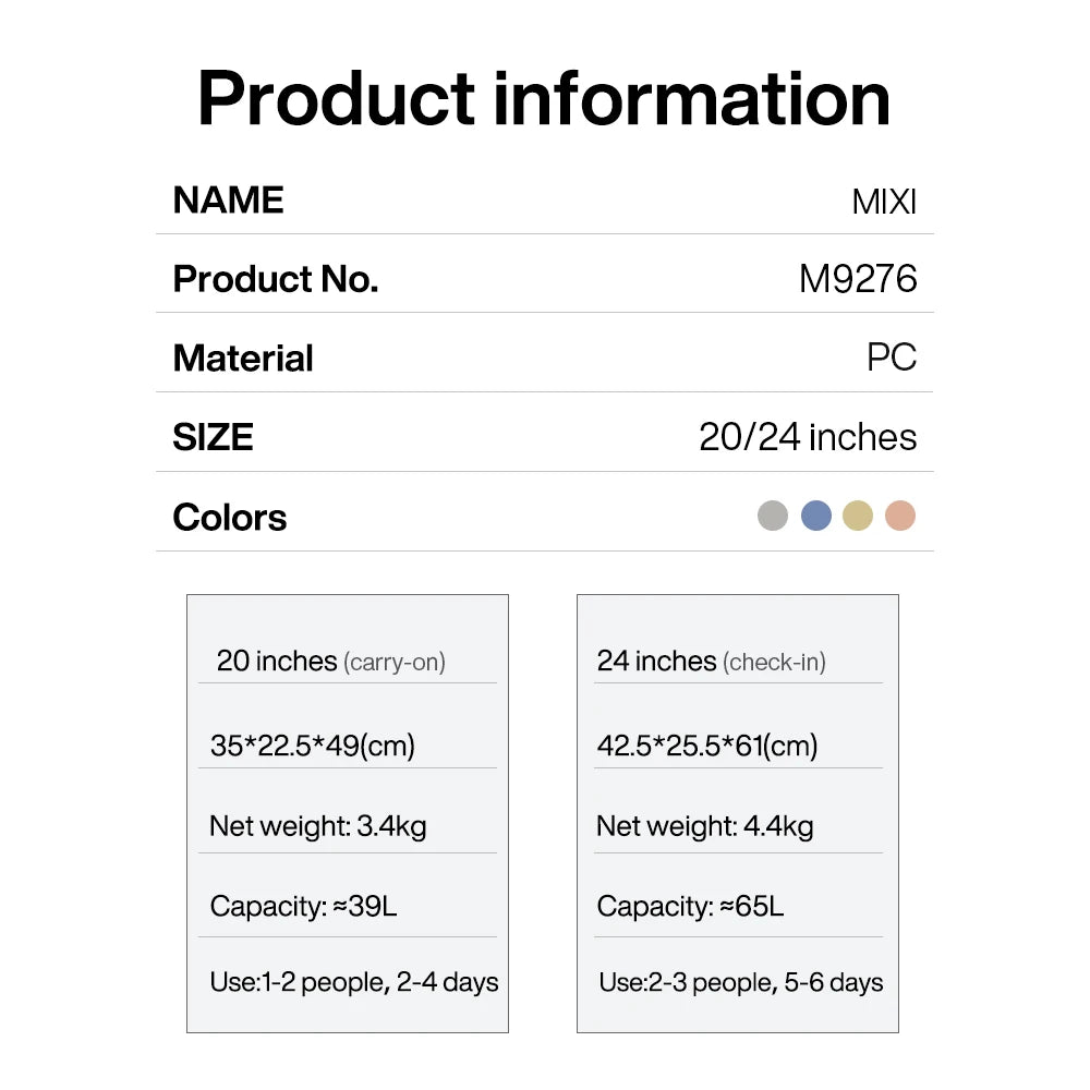 Mixi Wide Handle Travel Luggage | Hardside PC Suitcase with Rolling Spinner Wheels & TSA Lock | 20/24 Inch Unisex